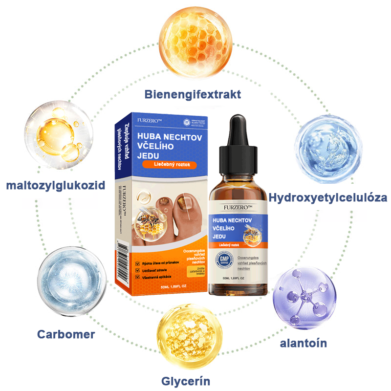 Furzero™ sérum má účinné zloženie obohatené o včelí jed, ktorý obsahuje peptidy a proteíny so silnými antimikrobiálnymi vlastnosťami. Tieto bioaktívne zlúčeniny účinne bojujú proti rôznym mikroorganizmom vrátane plesní tým, že narúšajú ich bunkové štruktúry a metabolické procesy.To poskytuje účinné riešenie na udržanie zdravých nechtov bez plesní.